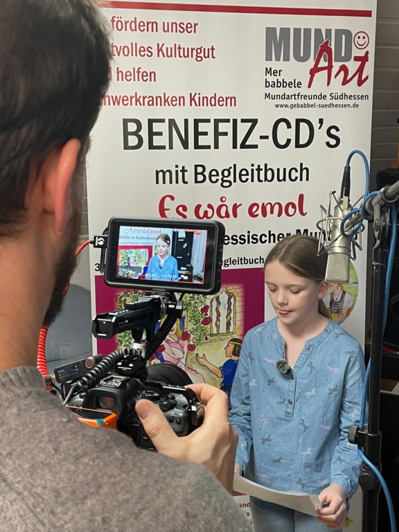 Bei der Feierstunde wurde ein Video aus dem Modautaler Tonstudio von Fritz Ehmke gezeigt bei dem unter anderem die Kinder Sophie Rettig aus Rimbach und Jakob Peter aus Lautertal aus dem Märchenbuch vorlesen sowie eine Szene bei der die Tonaufnahme für das Projekt „Grodde unn Lauser G’schischde aus Südhesse“ mit der Grodd Frieda nachgestellt wurde. Silke Durrer, Lehrerin und Ideengeberin zu diesem Projekt aus Mörlenbach, appelliert dabei an Eltern und Großeltern, mit ihren Kindern und Enkeln den heimischen Dialekt zu pflegen nach dem Motto: „Mundart wird geschützt, in dem man sie benützt“