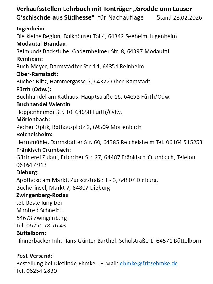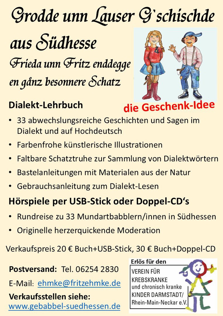 Das einzigartige Benefiz-Projekt der Mundartfreunde Südhessen „Grodde unn Lauser G´schischde aus Südhesse“ wird ab sofort als Lehrbuch und Tonträger per USB-Stick oder Doppel CD zum Verkauf angeboten.