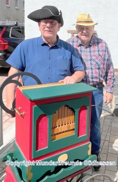 Bei bestem Wetter, hervorragender Organisation, netten Leuten, unterhielten Karl Ohl und Fritz Ehmke mit mundartlichem Gesang und Drehorgelklängen die zahlreichen Gäste auf dem idyllischen schönen Dorfplatz. Besondere Attraktion: Kinder und Erwachsene freuten sich, auch einmal die Drehorgel zu leiern. Das hat viel Freude bereitet. Wir mussten versprechen, im nächsten Jahr wieder zu kommen.