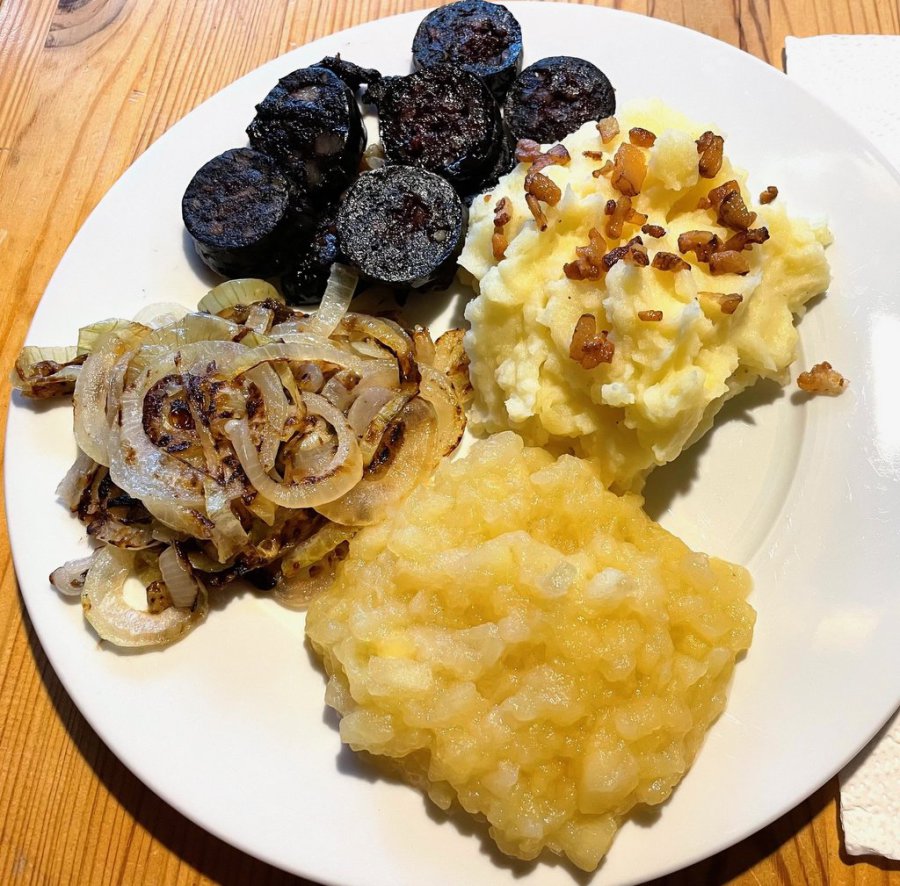 Blutworschd unn Zwewwel uff de Kadoffelbrei gewwe unn den Ebbelbrei dodezu esse.